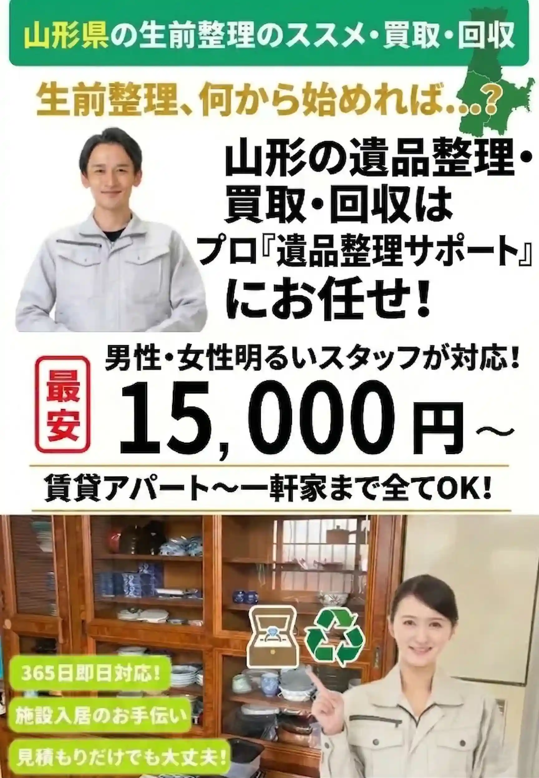 | 許認可情報・有資格 | ⚫︎古物商許可番号 山形県公安委員会 許可取得済み ⚫︎遺品整理士 一般社団法人 遺品整理士認定協会 認定 ⚫︎遺品査定士 一般社団法人 遺品整理士認定協会 認定 ⚫︎事件現場特殊清掃士 一般社団法人 事件現場特殊清掃センター 認定 |