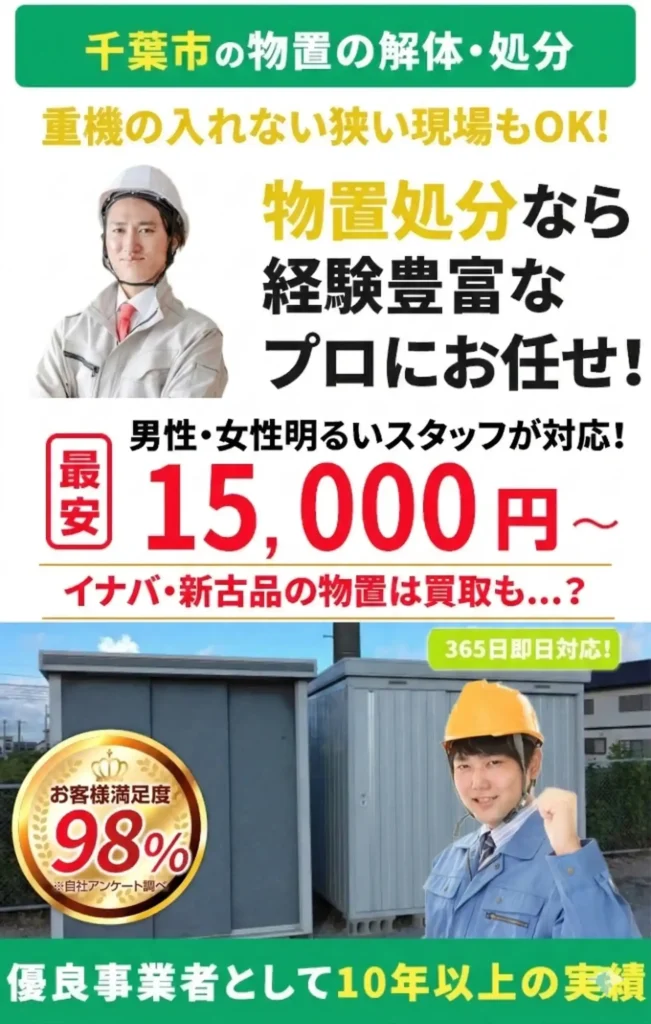 | スチール製物置 | 中型(例:幅 約1.8m × 奥行 約1.2m × 高さ 約1.9m) | 20,000円 ~ 40,000円 |